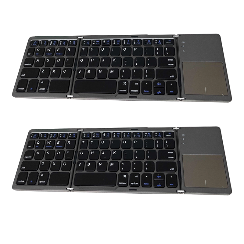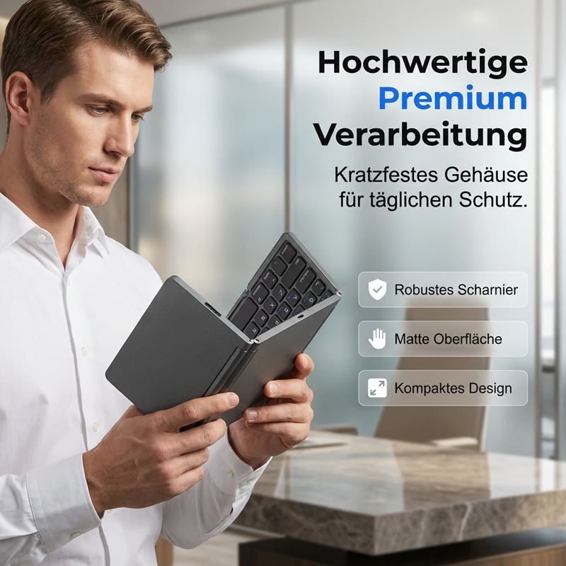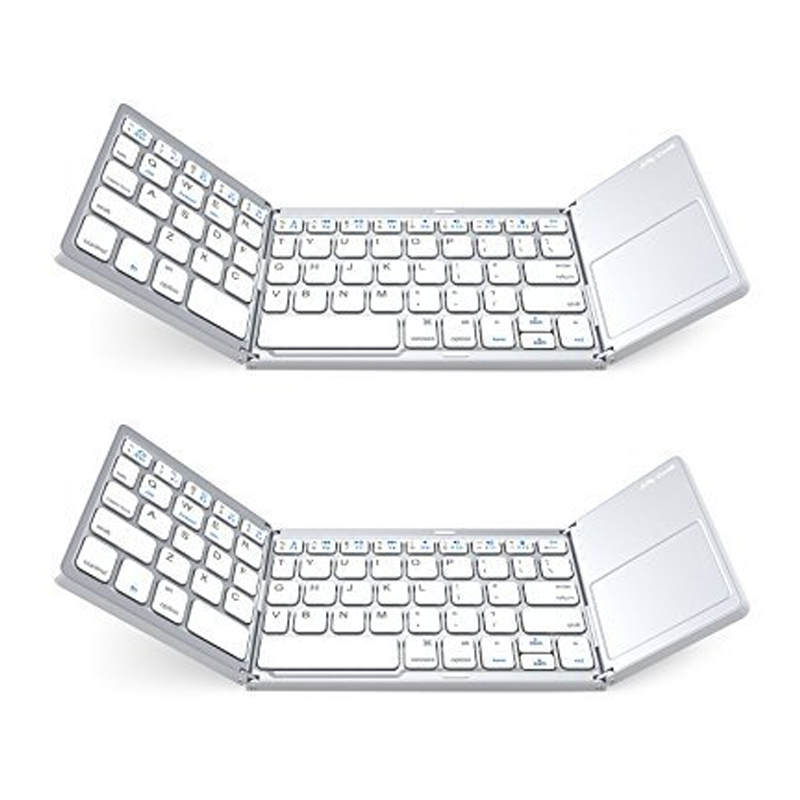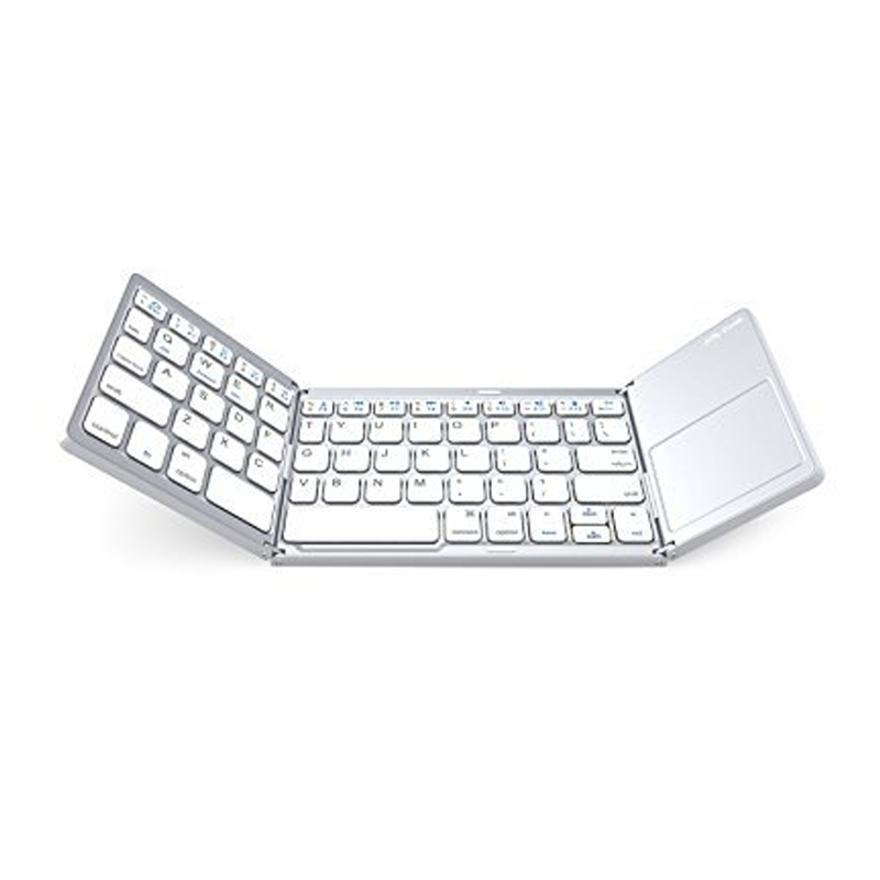 TECLADO BLUETOOTH DOBRÁVEL ULTRACOMPACTO - Experimente a máxima produtividade em movimento com este teclado Bluetooth dobrável em três partes. O touchpad integrado e o design ergonômico fazem dele o companheiro perfeito para tablets e smartphones.