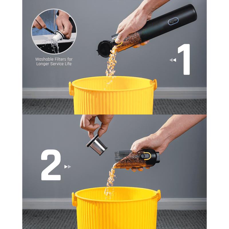 Carregamento rápido USB-C – Use o cabo de carregamento rápido Tipo C para carregá-lo a qualquer hora e em qualquer lugar, e ele pode ser totalmente carregado em apenas 2 horas. Anel de luz de operação, status de operação/carregamento visível de relance. Fácil de limpar – Com apenas um clique, você pode esvaziar a lixeira sem sujar as mãos. A trava no recipiente de poeira evita que ele seja aberto acidentalmente. O filtro de aço inoxidável e HEPA também pode ser removido para uma limpeza mais profunda.