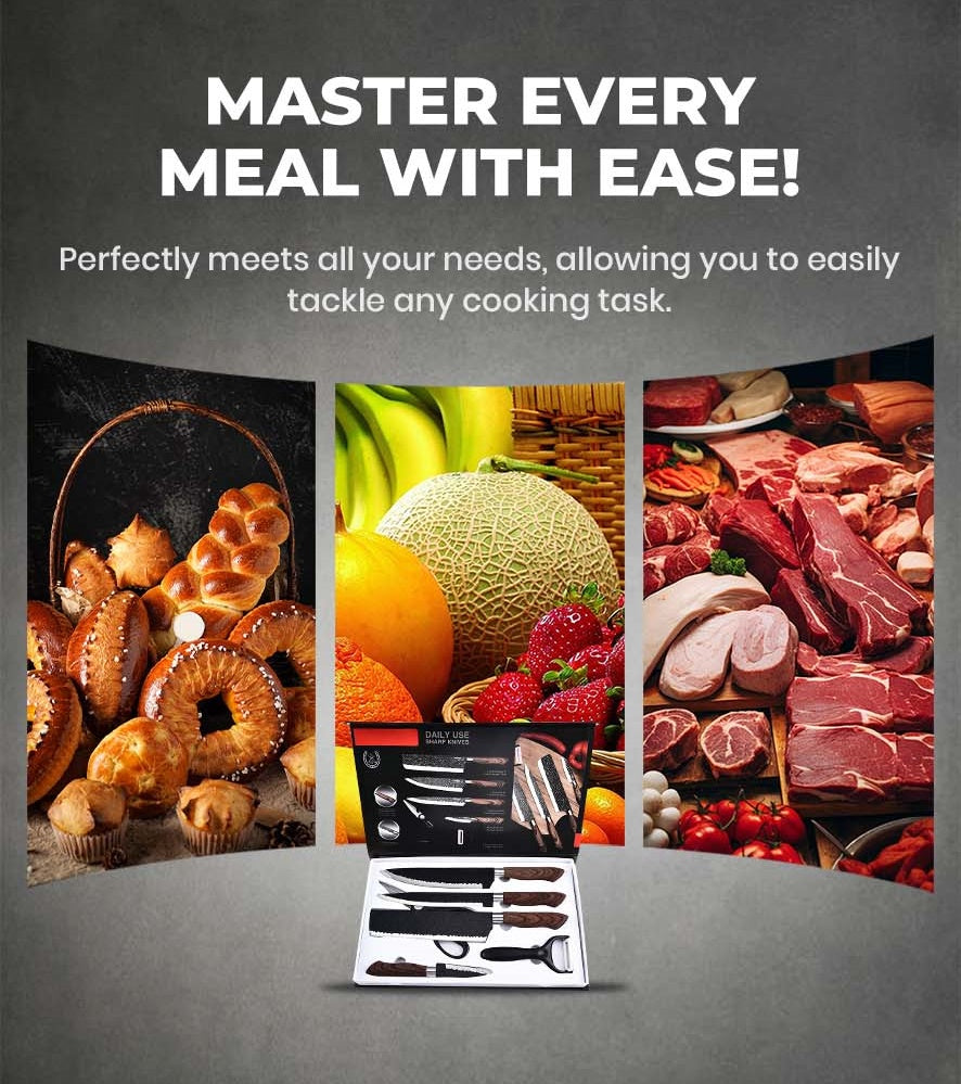6-PIECE SET - This comprehensive kitchen knife set includes a chef's knife, meat knife, paring knife, utility knife, kitchen scissors, and a peeler. Perfect for all your culinary needs, it equips you for any cooking task with ease.