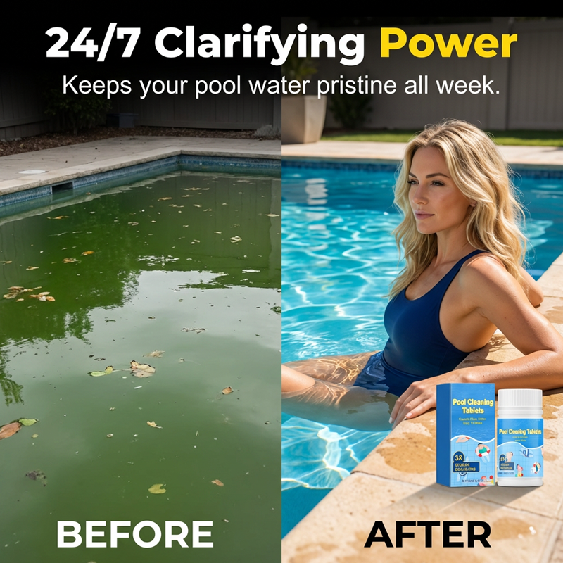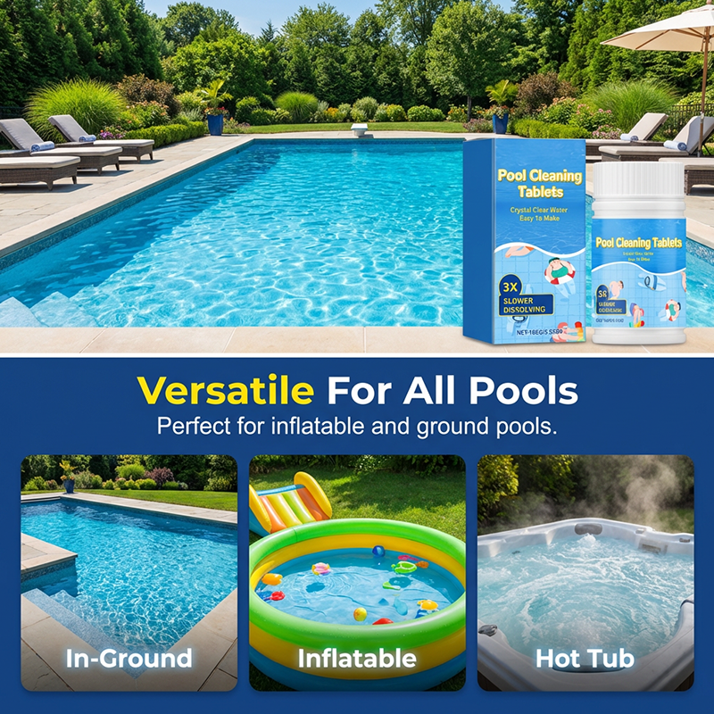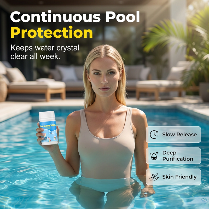 COMPRIMIDOS DE LIMPEZA PARA PISCINA DE ÁGUA CRISTALINA - Obtenha água de piscina cristalina sem esforço com nossos comprimidos de limpeza premium para piscina. Formulados para dissolução lenta, eles eliminam odores e manchas para uma experiência de natação impecável.