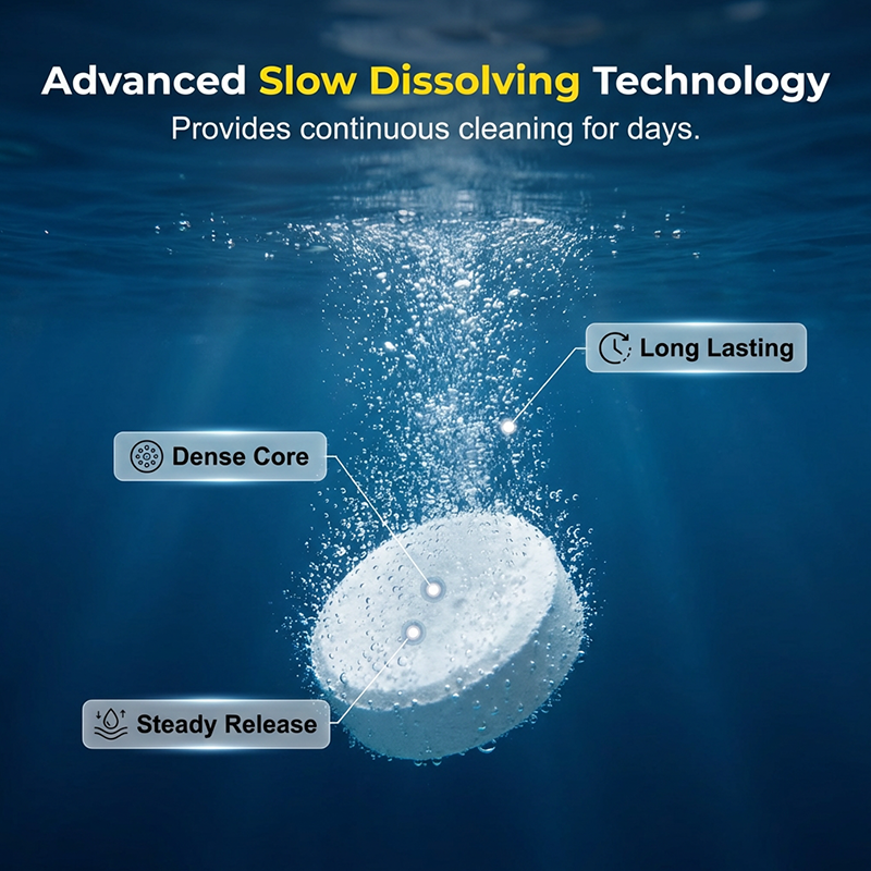 TECNOLOGIA AVANÇADA DE DISSOLUÇÃO LENTA - Projetados com uma taxa de dissolução 3X mais lenta, estes comprimidos garantem uma liberação constante e contínua de agentes de limpeza. Isso significa manutenção menos frequente e química da água consistentemente equilibrada.